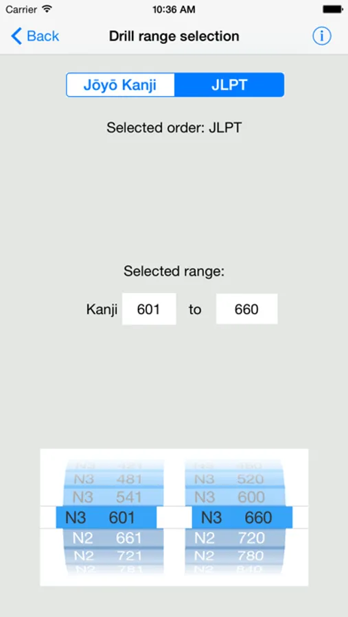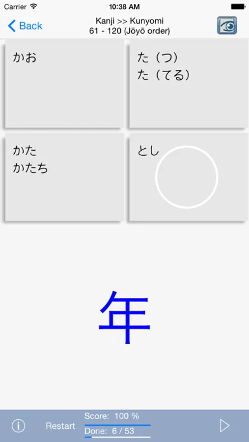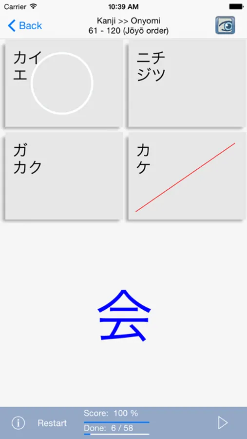 * Ten multiple choice drills on meanings, On-yomi (Chinese readings) and Kun-yomi (Japanese readings), Radicals (bushu) and elements.
