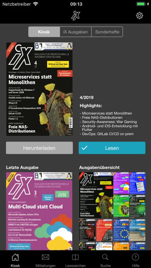 Monatlich präsentiert Ihnen die Redaktion Tipps, Berichte und Reportagen, die der Technik auf den Grund gehen: gründlich recherchiert, kritisch analysiert und unabhängig geschrieben. Die iX-Sonderpublikationen sind ebenfalls in der App verfügbar.