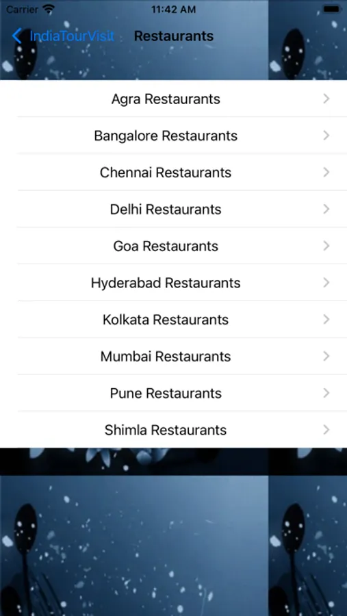The Restaurants in each city are listed .The contact details, address, timings are provided.