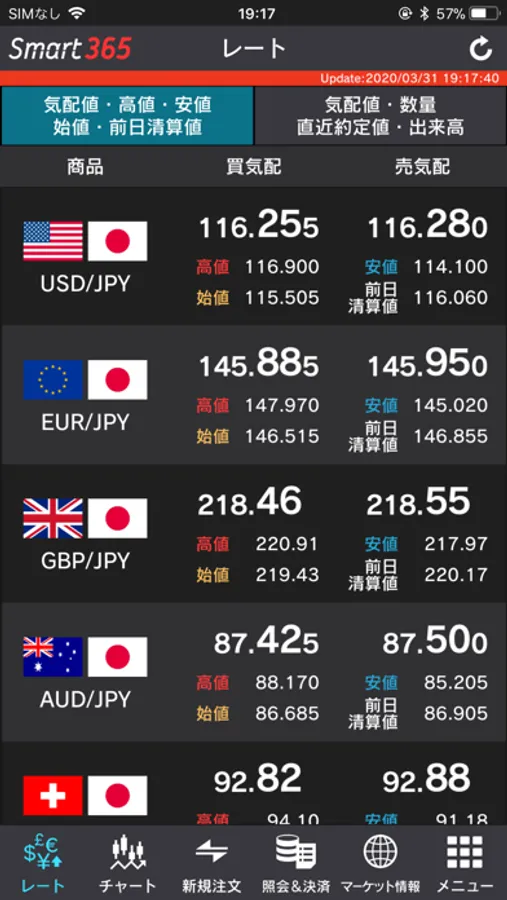 リアルタイムチャート機能:移動平均線、一目均衡表など14種類が利用可能、Tickから月足までの各足種別を備え、チャートからの注文も可能