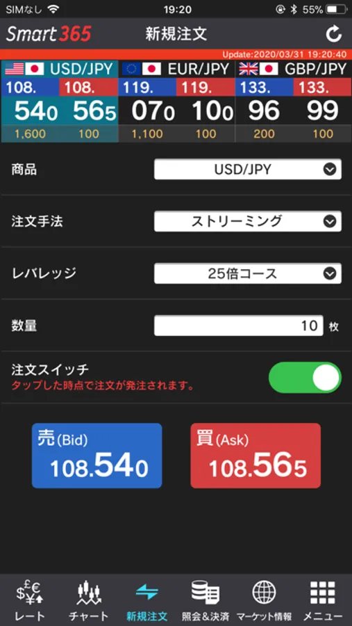 注文:ストリーミング、成行、指値、トリガ(トレール機能)、IfDone注文など