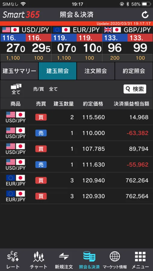 照会:建玉照会、注文照会、約定照会、証拠金状況照会、入出金履歴照会、取引報告書