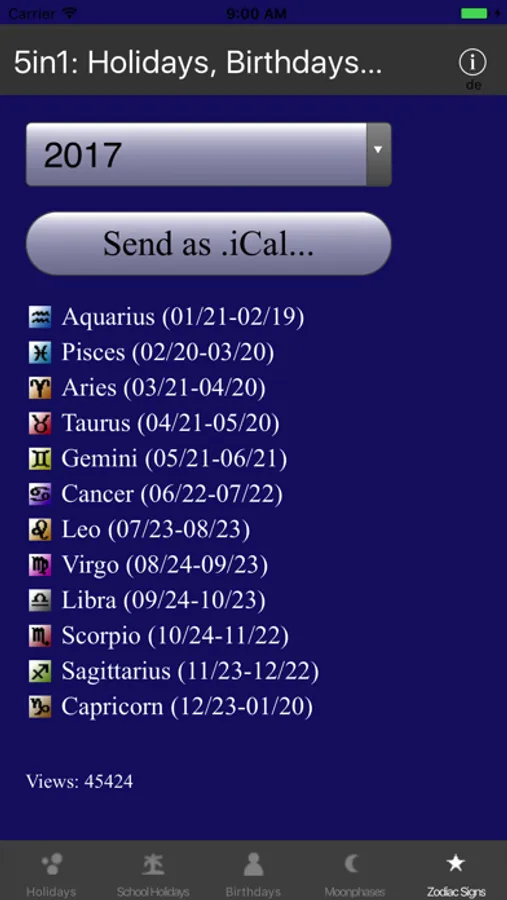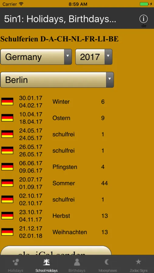 This App shows the Holidays from 10 Countries, the German, Austria, Swizerland, Holland, France, Liechtenstein and Belgie School-Holidays, Birthdays from Contacts, Moonphases and Zodiac Signs. You can send the data to yourself per email and add to the calendar or show it as additional .iCal-calendar.