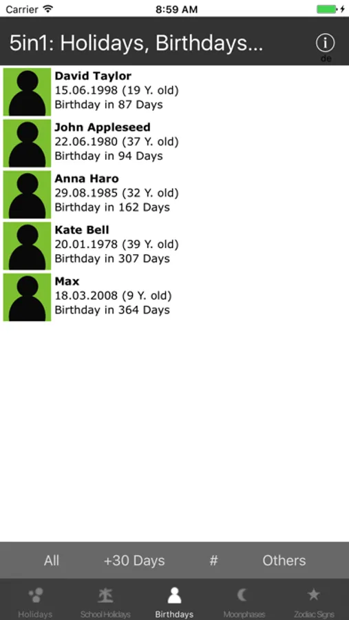 Shows the birthdays from contacts as sorted list with name, birtdaydate, age, days until birthday.