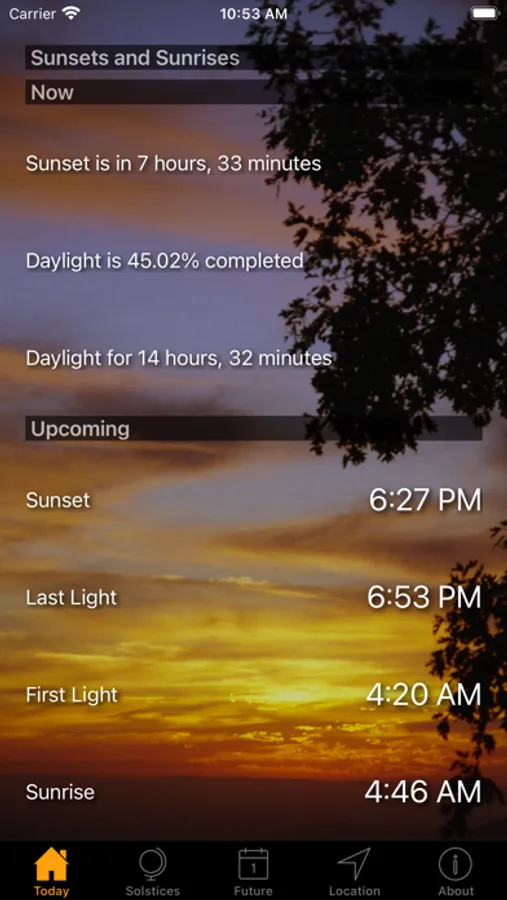 Live by the Sun! See not only the Sunrise and Sunset times but also the First and Last Light times for exactly where YOU are right now – not the "closest" city. See exactly how much daylight is left in the day - in a large, simple, easy to read display - so you can plan ahead to the last speck of daylight. Both iPhone and iPad support is included in the price. This IS the app you are looking for!