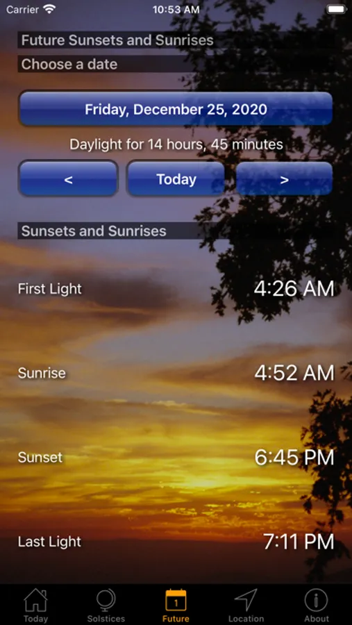 • See the Sunrise, Sunset, First and Last light times for any day in the future.
