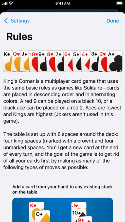 Move over Solitaire, there's a new king of card games! King’s Corner, or Kings in the Corner, is a great game for all ages—easy to pick up and endlessly entertaining. Play on your own with an AI that’s as challenging as you like: one to three opponents can miss moves while you’re still learning and be laser-accurate once you’ve mastered the game. Play with friends online via Game Center or in-person with our pass & play mode that’s all the fun with none of the shuffling and dealing.
