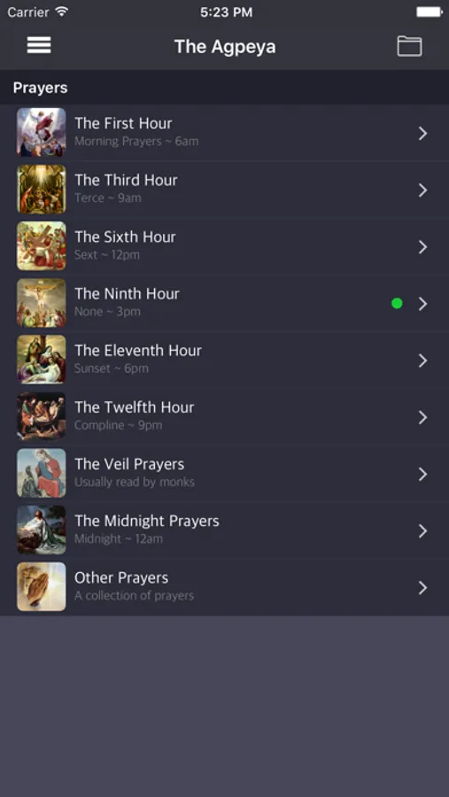 The Coptic Orthodox Agpeya (Agpia), is a prayer book, "the book of hours". It contains prayers for 7 different hours to be said out throughout the day. The hours are chronologically laid out in a neat way, each containing a theme corresponding to events in the life of our Lord Jesus Christ.