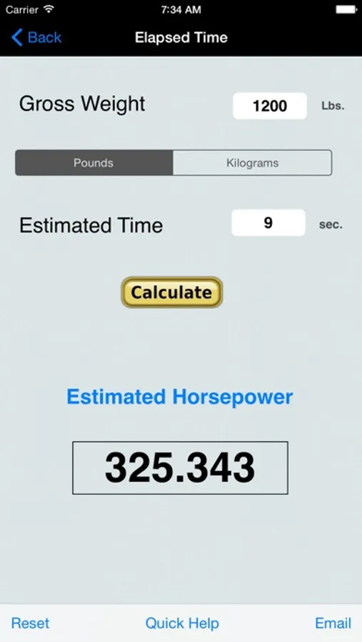 The Estimated Time method uses the gross weight of the car, including the driver, and the time it took that car to travel the quarter-mile run, which is 1330 feet or 0.405 kilometers.