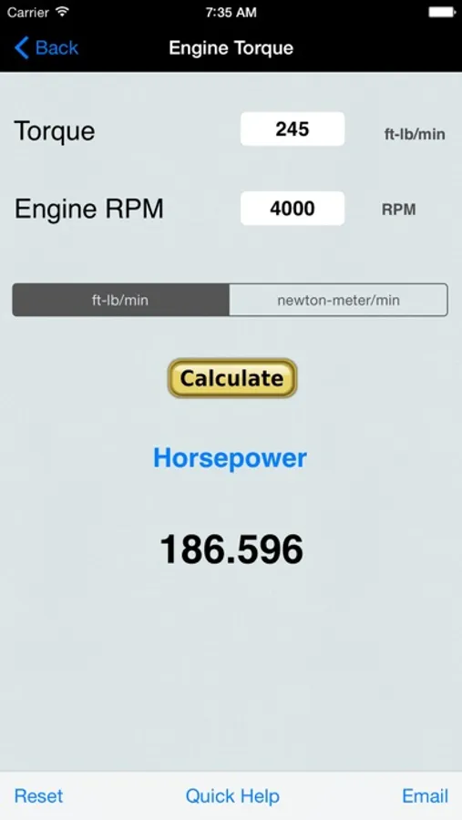 The Torque speed method uses the torque in foot-pounds times the engine speed in revolutions per minute, RPM, divided by 5,252 to get the horsepower.