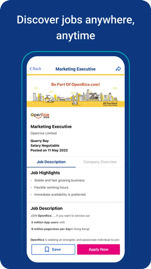 Asia’s leading portal for job search, recruitment, and career growth, the JobsDB Job Search app provides a wide range of work opportunities and vacancies to jobseekers. Whether you’re a student who’s nearing graduation and needs an early internship or a part-time employee just looking for a freelance or trainee post, we’ve got you covered.