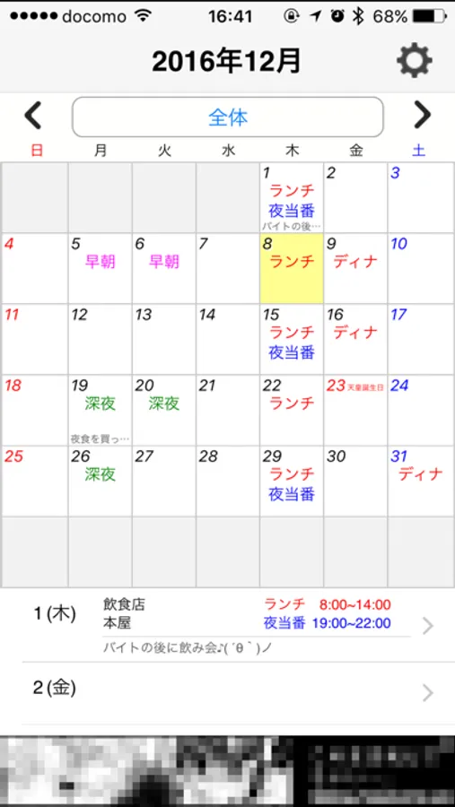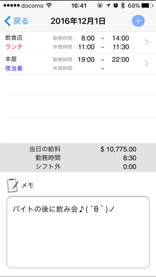 時間と時給を設定することで、予定に登録された時間から自動的にお給料を計算して一日単位で表示してくれます。