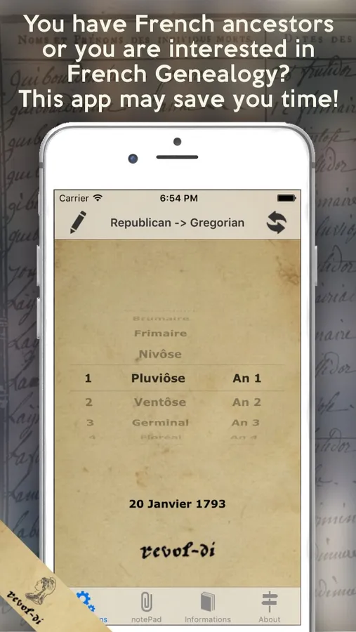 With revol-di, you can convert easily and rapidly the dates of the French Republican calendar into the Gregorian one, and vice versa.