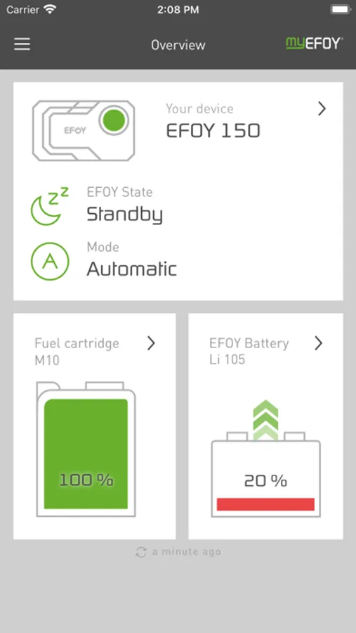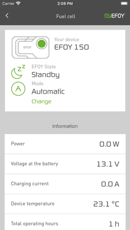 Turn your smart phone or tablet into a remote control for your EFOY Fuel Cell with the EFOY app myEFOY function. Choose the operating with the press of a button and see all important data regarding your fuel cell, fuel cartridge and battery all on one screen. To control your EFOY Fuel Cell with myEFOY, you will require the EFOY Bluetooth adapter, the EFOY app and the latest firmware version. Download immediately for free!