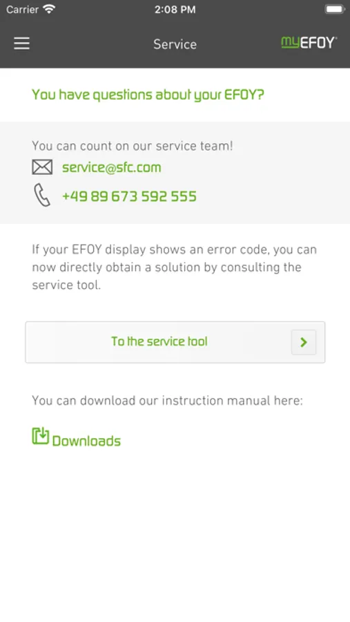 With the EFOY app, you will always have all information regarding your fuel cell at hand. Find the next fuel cartridge retailer in your vicinity with the practical EFOY app, contact our service department and follow all news related to your EFOY.