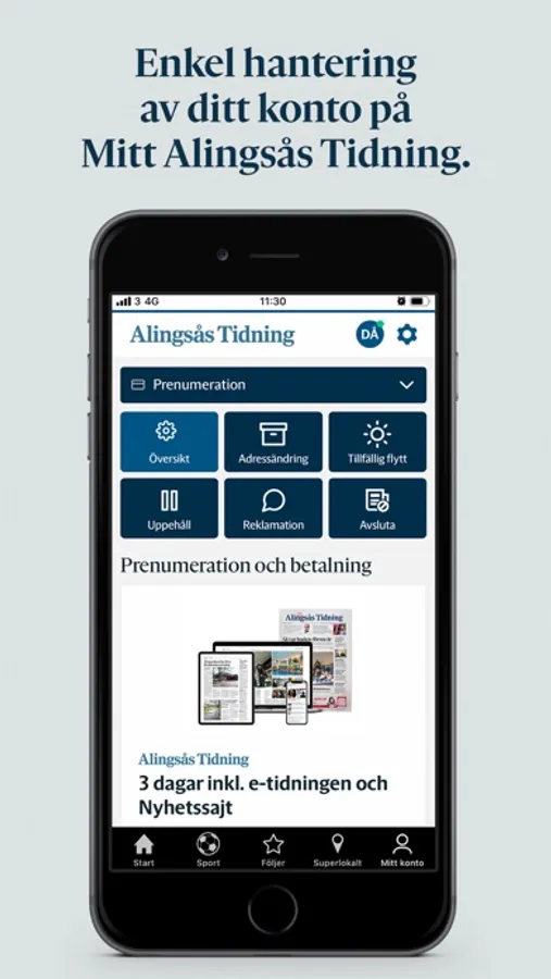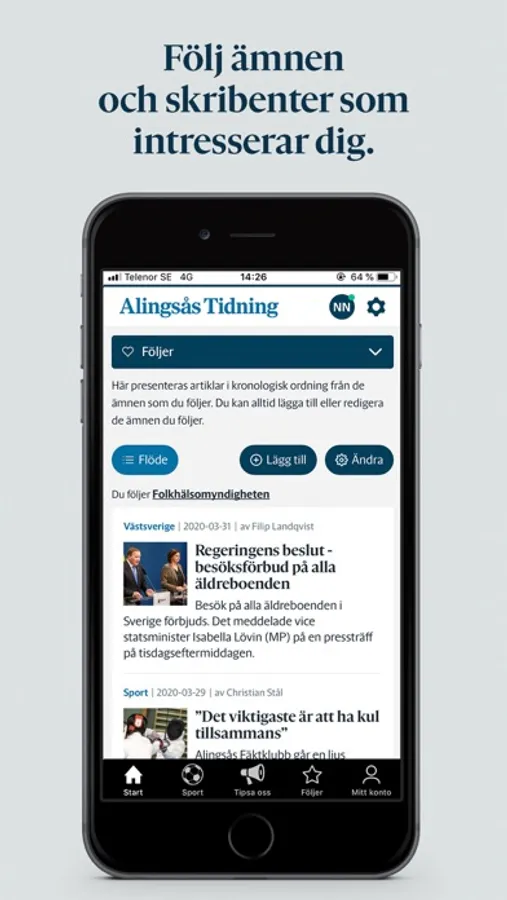 Med Alingsås Tidnings app kan du följa de ämnen och skribenter som du bryr dig om och skapa ditt eget nyhetsflöde. Du kan dessutom ställa in så att du får en pushnotis när något har hänt inom dina bevakade områden.