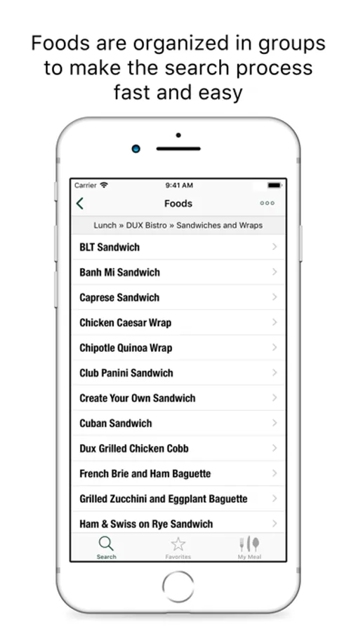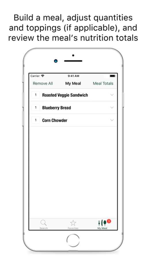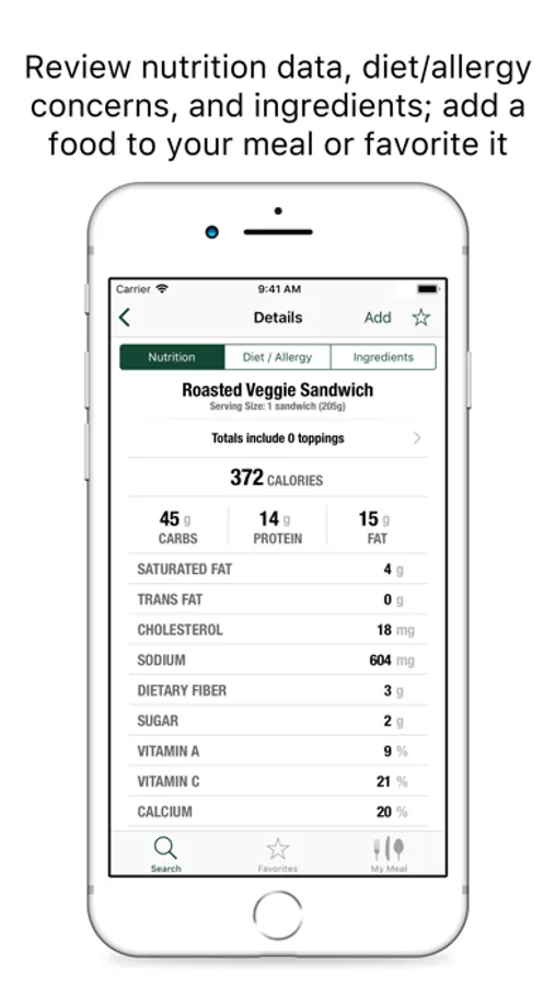 After configuring any toppings/condiments that may be available, add the food to your meal, and review your entire meal total to gain perspective on your dietary choices. And if you eat particular foods on a regular basis, favorite them to expedite future build-a-meal sessions.