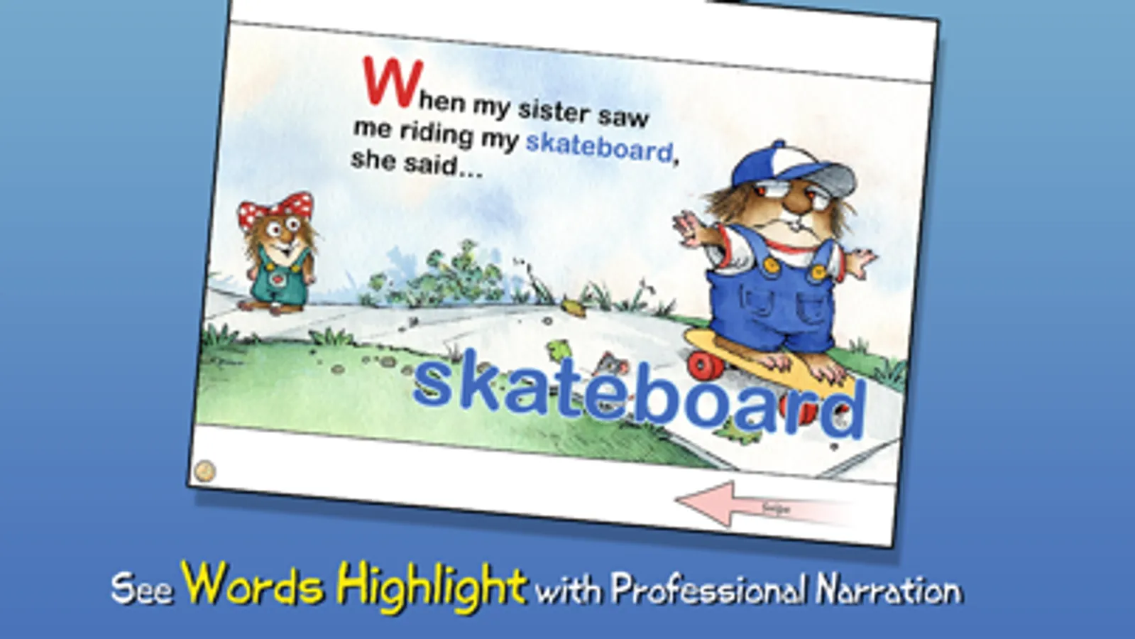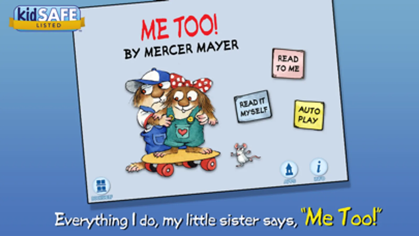 Join Little Critter in this interactive book app as his little sister tags along wherever he goes, saying "Me Too!" to everything from playing football with his friends to eating the last piece of cake! Explore pictures, learn new vocabulary, and personalize the story with your own narration. Jump inside to find out how Little Critter learn that sharing with your siblings is good because sometimes they share back!