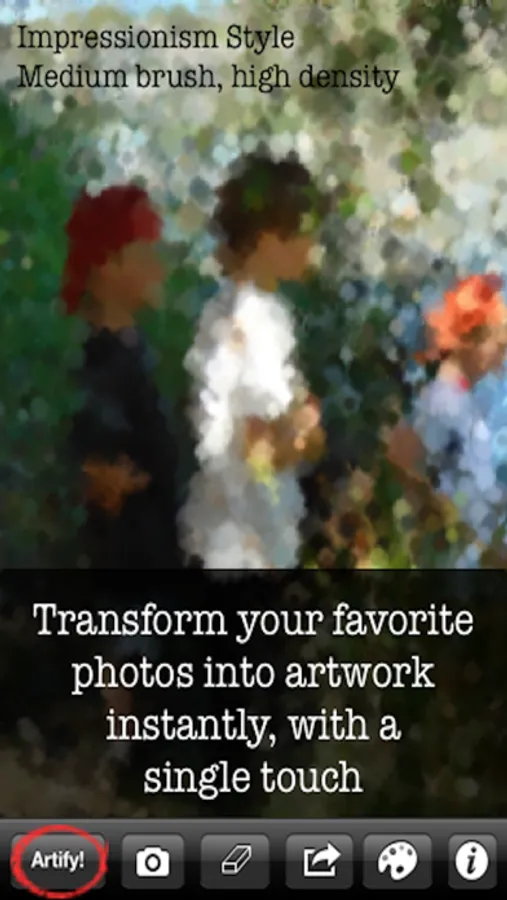 Inspired by the great Impressionist painters Monet, Renoir, and Degas, Artify instantly transforms your favorite photos into masterpieces. Create gorgeous impressionistic interpretations of photos of friends, family, landscapes, or anything at all. Reveal and highlight any detail you want with just the touch of a finger.