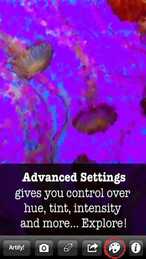 • Take or import photos and transform them with a single touch of the "Artify!" button into impressionistic artwork