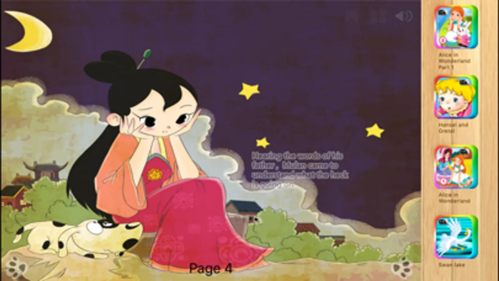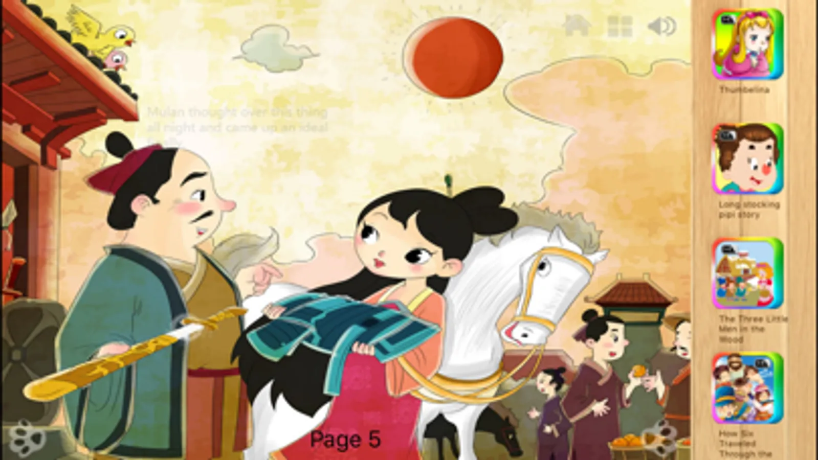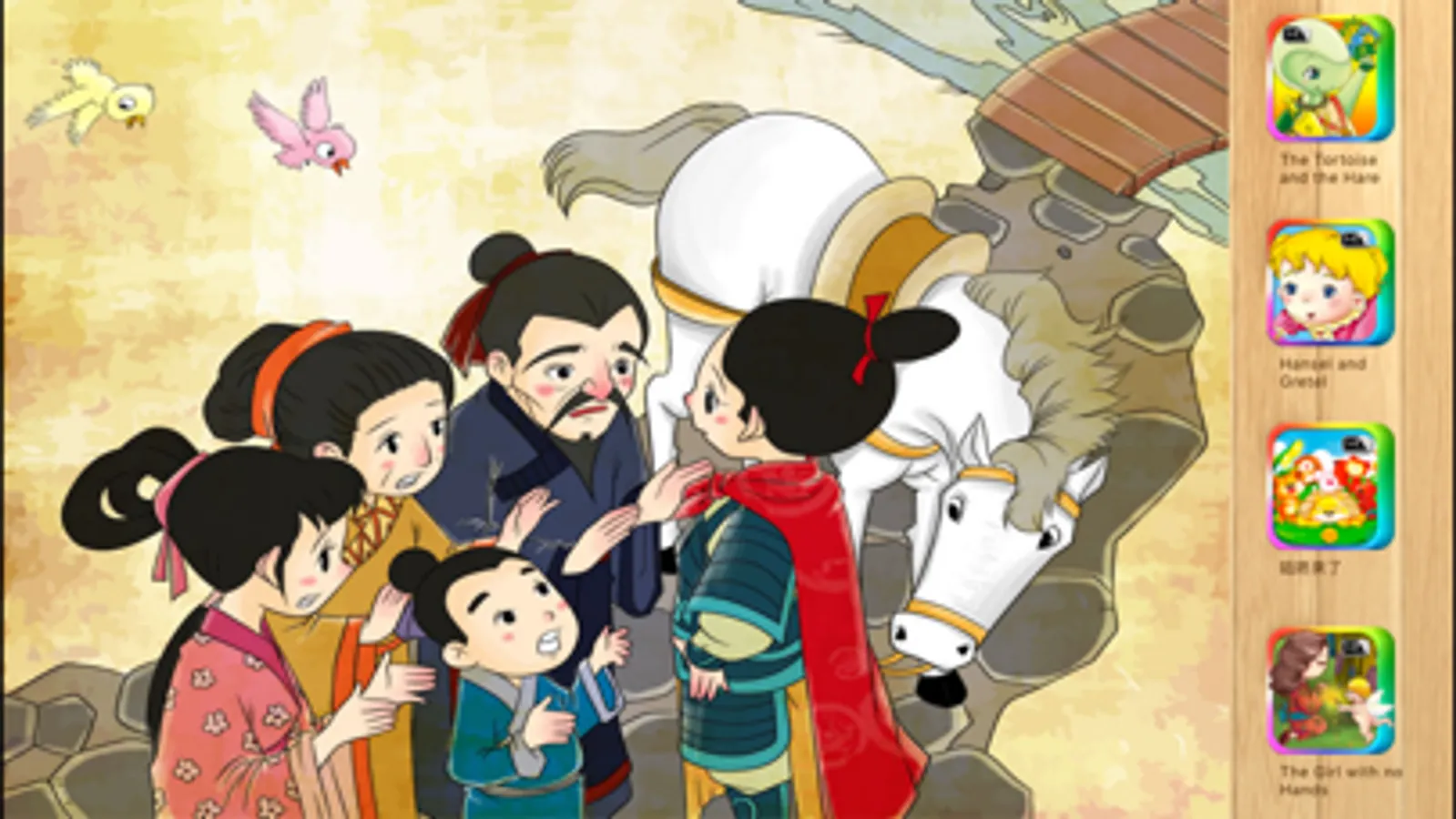 • Stunning animation effect on each page: Hua Mulan riding horse, archery. The stars, the moon on the sky in the evening, and the bird flying in the sky and etc. special effects, make the person at the scene.