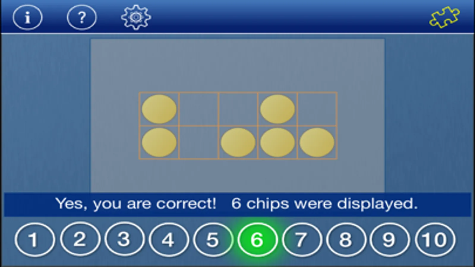 Subitizing, or quickly recognizing the quantity of objects in a group without having to count, is an important number sense skill. Practice recognizing the number of dots in a variety of pattern types including from 1 to 10 dots. Dice patterns and patterns based on 10-frames are included. Patterns are made with one or two colors. Set the length of time a pattern is shown and the range of dots displayed. The iPad version also incorporates up to 20 dots and two 10 Frames