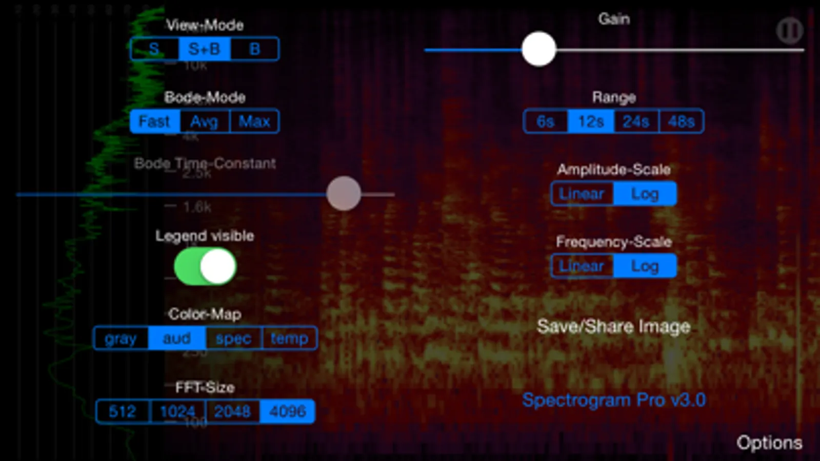 You can choose between four FFT-resolutions, logarithmic or linear fequency and amplitude scale and four color-schemes and adjust the sensitivity. Also you can share and save the spectrogram-images. There are also bode plot-modes with averaging and maximum-calculation. The spectrogram is updated with 60Hz for a super-smooth and comfortable experience.