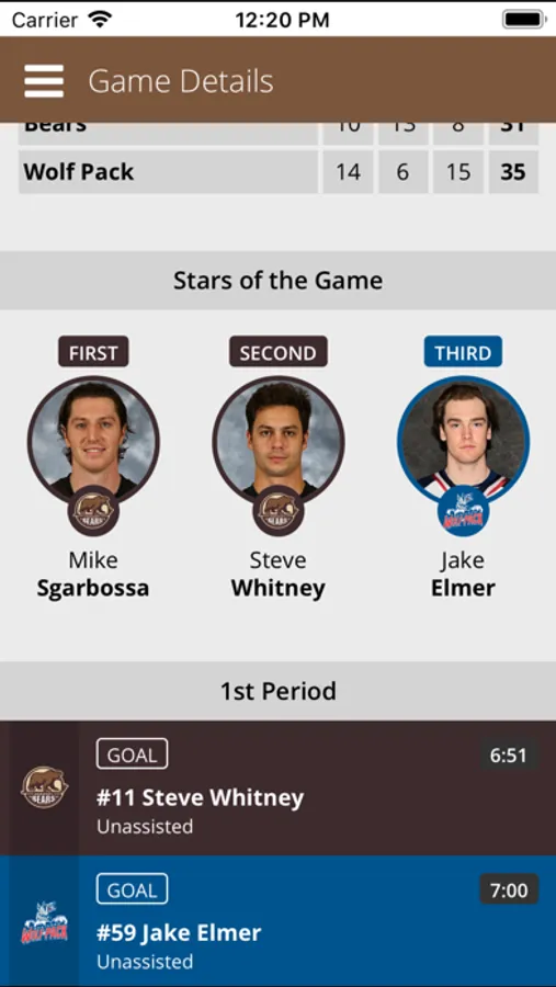 The Game Day view provides real time statistics for live games, and post game information including the three stars.