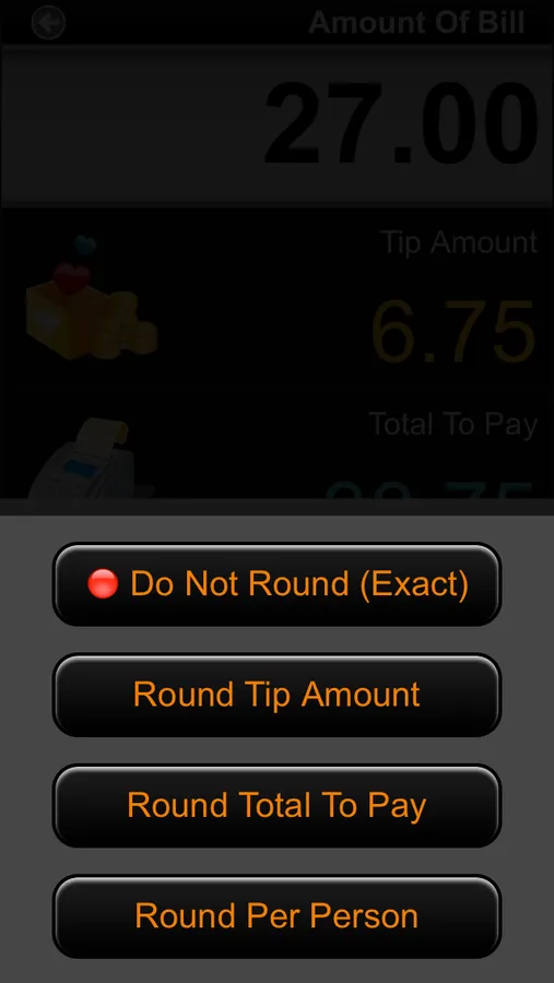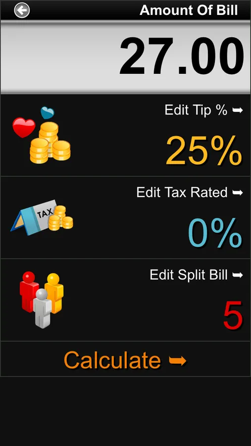 1- Split a check evenly: Enter the number of people in your party and choose a tip percentage. The application will calculate the total tip amount, total to pay then split the check into portions equal to the number of people in your party.