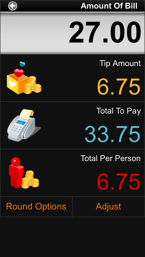 2- Split an uneven check: Often people would rather pay for exactly what they ordered, and this is where the Cool Tip Calculator application really shines. Simply use the "Adjustments" feature, the application will then auto calculate the right amount of check total plus tip that each person needs to pay.