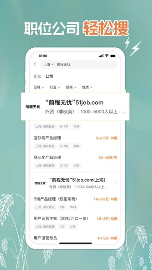 许多知名公司、世界500强企业都在51Job招聘人才、发布职位。丰富的职位信息覆盖了各个行业、各个岗位,给求职者提供了更多的选择,每周有超过5,000万份简历通过51Job发送到招聘企业。