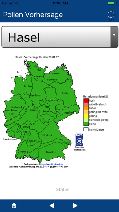Tagesgenaue Pollenvorhersage für Deutschland als Kartendarstellung. Die Daten stammen vom deutschen Wetterdienst und sind sehr genau. Es hilft Ihnen bei Allergien und Heuschnupfen.