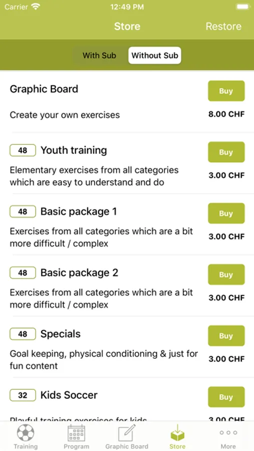After experiencing the setup of the App you will have the opportunity to buy into four segmented packages with 48 exercises each depending on your training interests.
