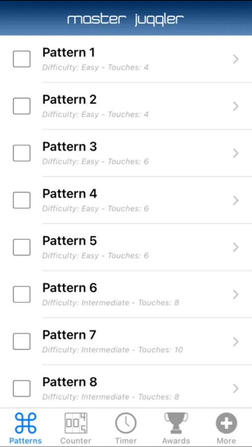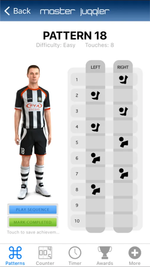 The heart of this app is the 48 patterns/sequences that challenge you to control the ball multiple juggles in advance. For instance, pattern 3 is Right Foot, Right Foot, Left Foot, Left Foot, Right Foot, Left Foot. Mastering this pattern teaches you to control the ball in a way that your touch needs to set up your next touch or you won't be successful. Each pattern ends on catching the ball. This ensures that your last touch on the ball was a controlled touch and not just contact on the ball.