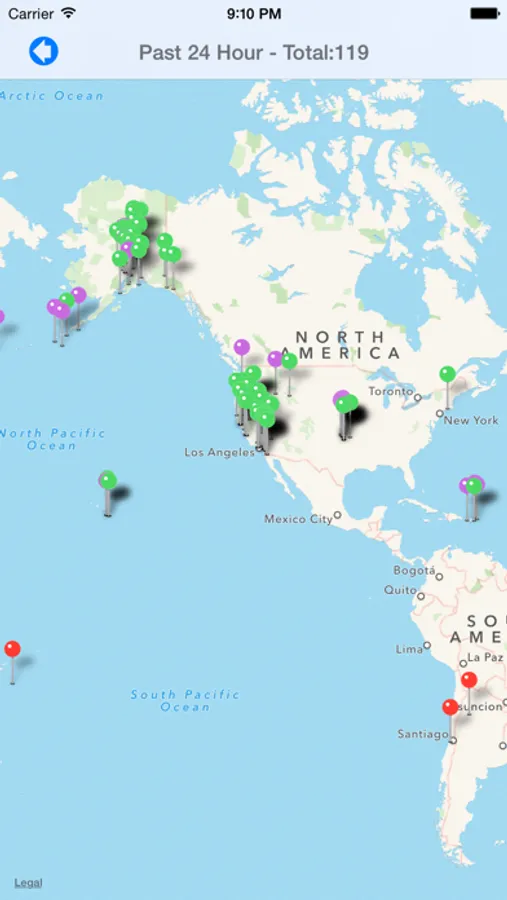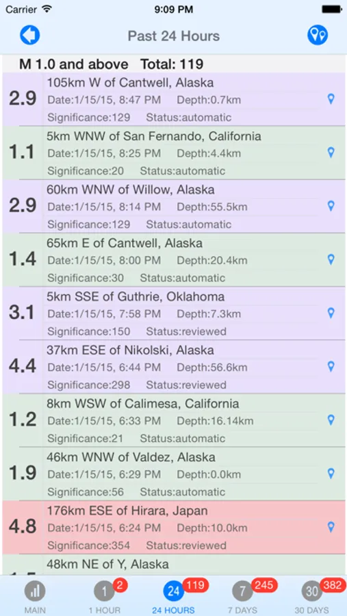 - Each pin displays Earthquake magnitude, location, significance, status, and date/time.