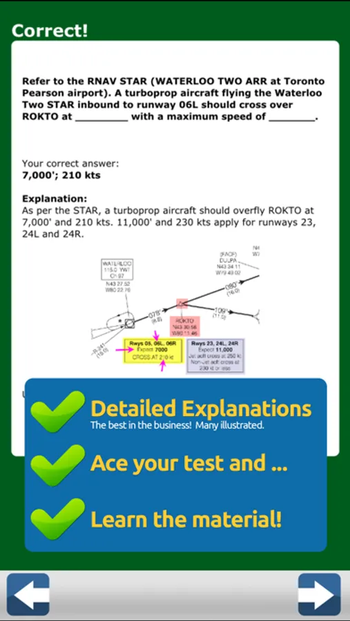 The entire test bank consists of around 1000 representative questions. All feature full explanations, many of which are illustrated. Best of all, you can be sure that the questions are current and representative, as not only do we have a professional and experienced team of CFI and Professional Pilot authors and editors overseeing our test prep content, but also updates are integrated and free. That’s right; updates are built-into the app such that you can with one click get access to the latest and greatest sample questions that our editors have made available.