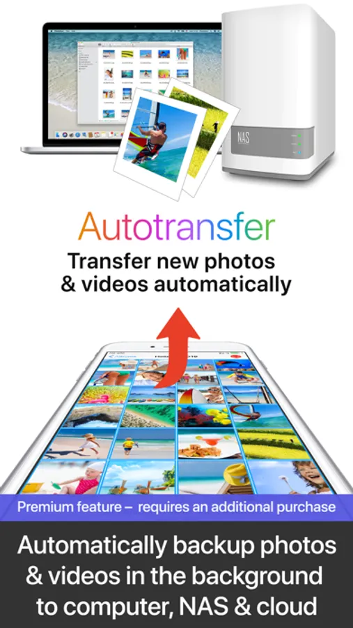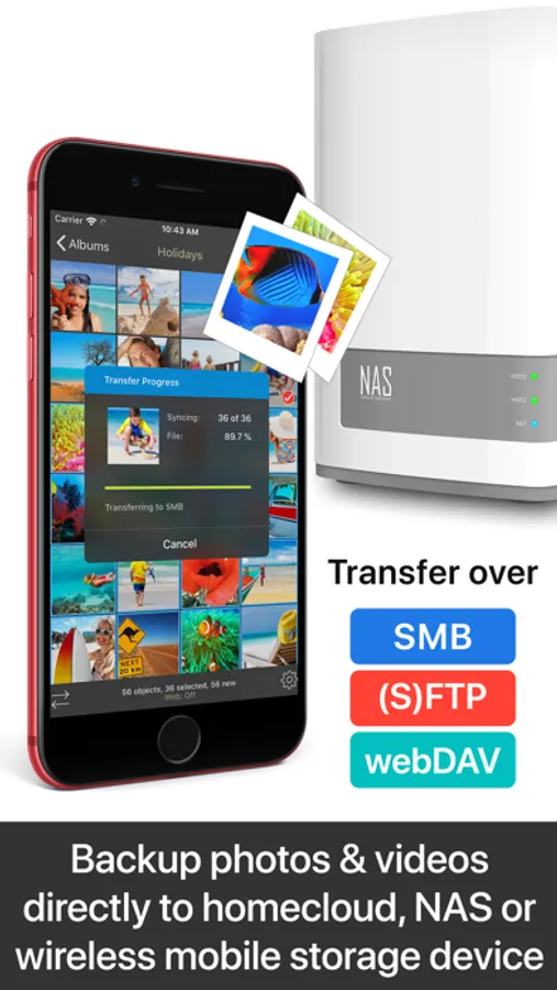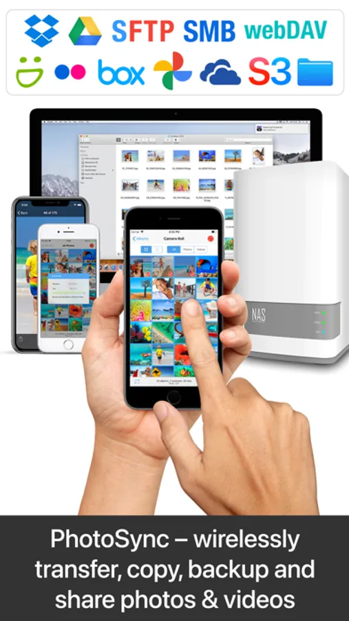 • Backup photos & videos to NAS devices, home cloud and wireless portable hard drives over FTP, SMB, WebDAV and SFTP. PhotoSync works flawlessly with: Synology, QNAP, Buffalo NAS, ownCloud, NextCloud, WD MyCloud, TrueNAS, OpenMediaVault, Seagate Personal Cloud…