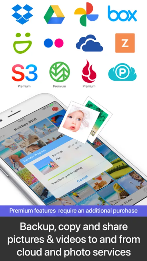 • Upload photos & videos to popular cloud and photo services like Dropbox, Google Drive, Google Photos, Flickr, OneDrive (Business), SmugMug, Box, Zenfolio, pCloud…