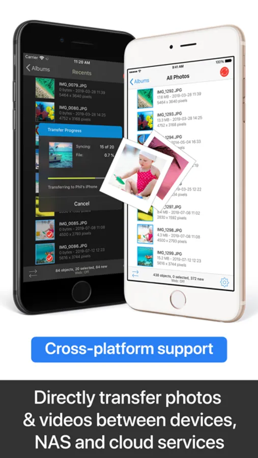 • Directly transfer photos & videos between devices over Wi-Fi, Bluetooth or Personal Hotspot. No computer, Internet or cloud are required.