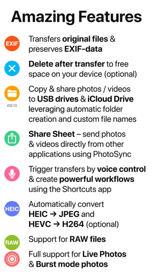 • Backup photos & videos to / from USB drives, iCloud Drive and local storage via the Files app (iOS13).