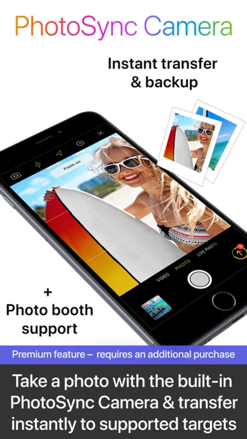 Take a photo with the built-in PhotoSync Camera and transfer it immediately to supported targets. Photo booth support over AirPlay & HDMI.