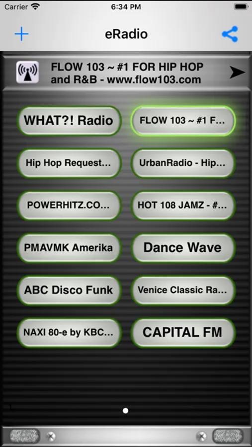 Just like a real tuner, eRadio stores your favorite stations into virtual buttons that later you can play, remove or even send them to your friends.