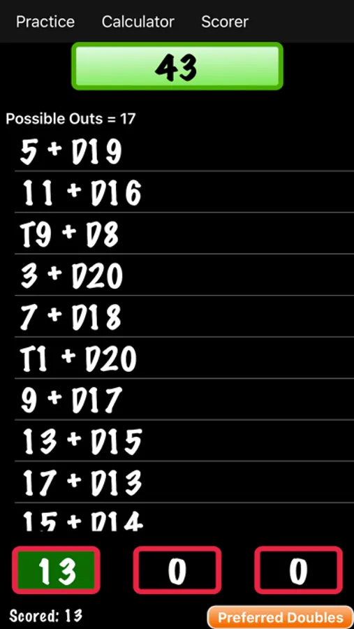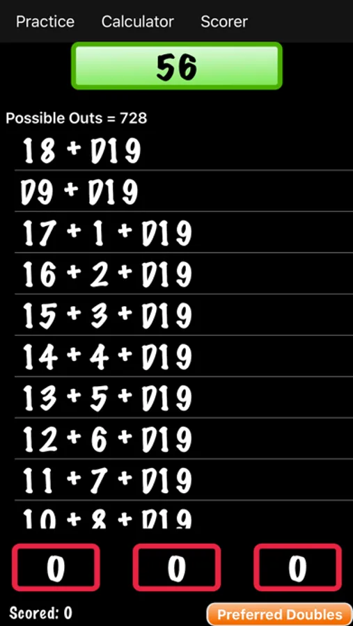 When you enter the third dart's value the score is updated and the table is changed to show all possible outs using three darts. The values for the darts are reset back to zero so that you can score another set of three darts.