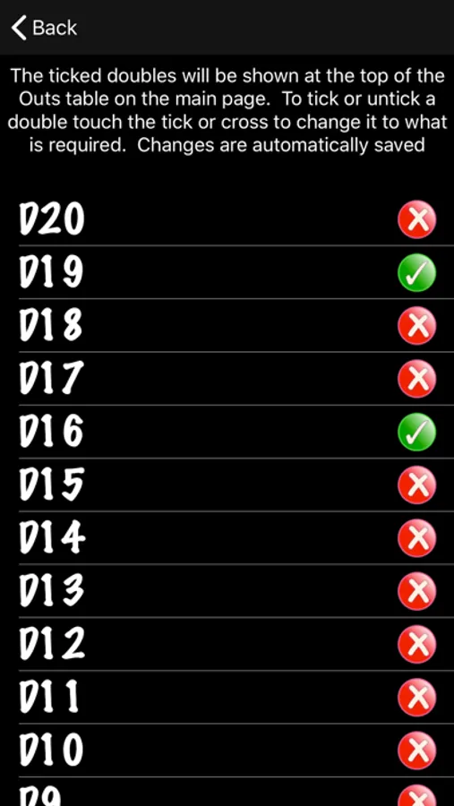 Do you struggle trying to remember the checkouts for various numbers in darts? I know I do. What are the various checkouts that are possible? When are there no checkouts possible. It is all made more difficult when you only have one or two darts left. Is there a checkout and you just cannot see it. Some are very obscure. There are literally tens of thousands of combinations for the checkout from 170 down to 2. This App aims to solve these problems for you. It has a comprehensive list of all of the possible checkouts for each starting value given the number of darts involved. It will show you what checkouts are possible and when there are no checkouts possible.