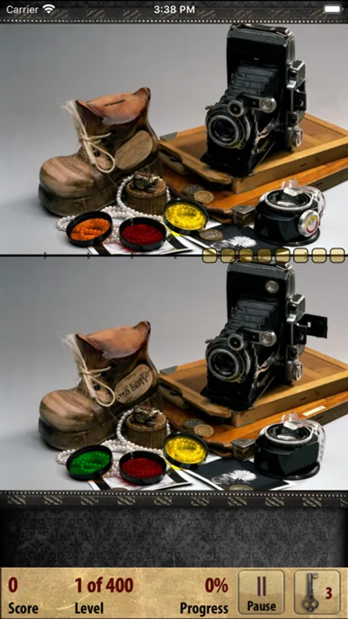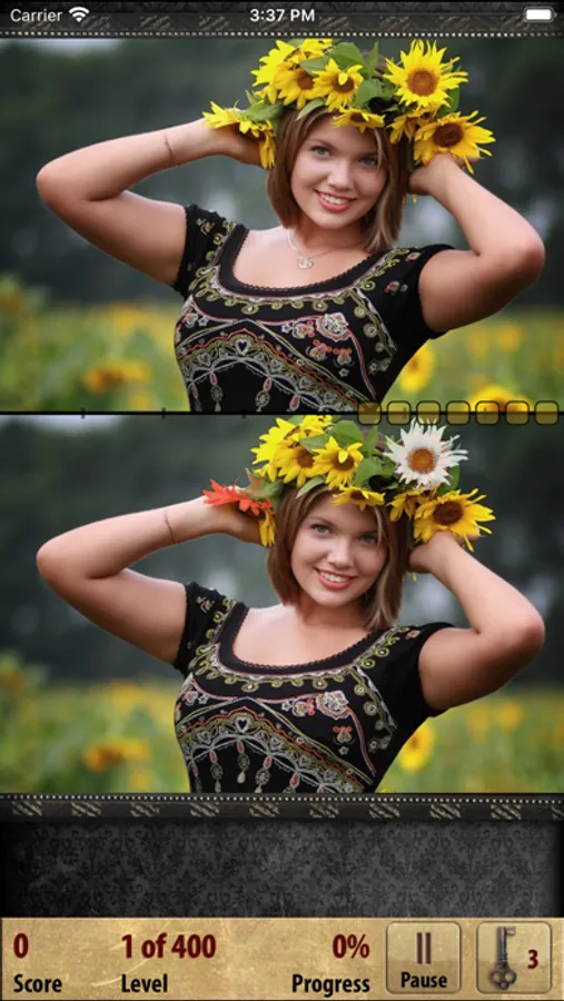 In each level, player is shown two photos that are identical except for some differences. The objective is to find and identify the differences between the pictures before the timer runs out. Players select potential differences by touching the screen on either picture in the location of difference. Correct choices highlight the difference and incorrect touches deduct time, with the game ending if time expires (timer is optional).
