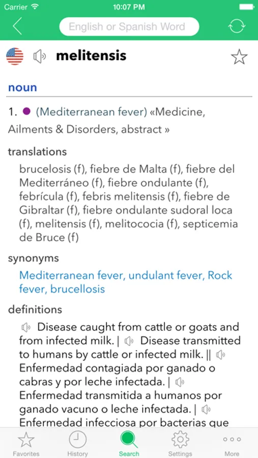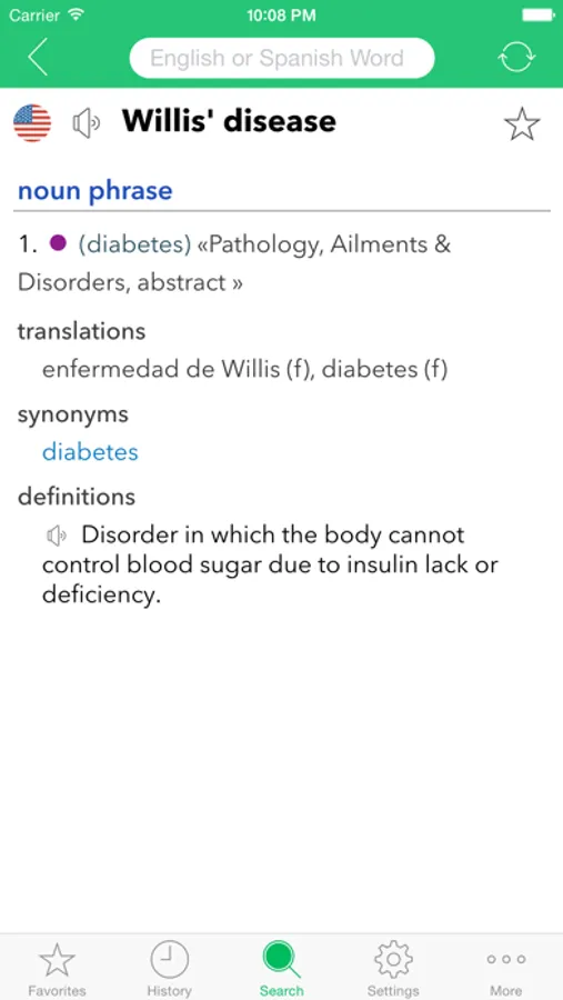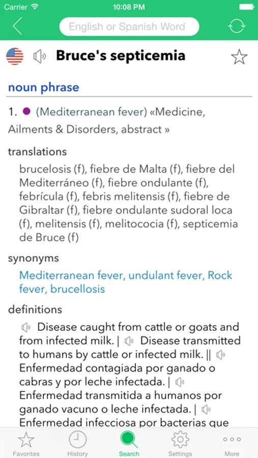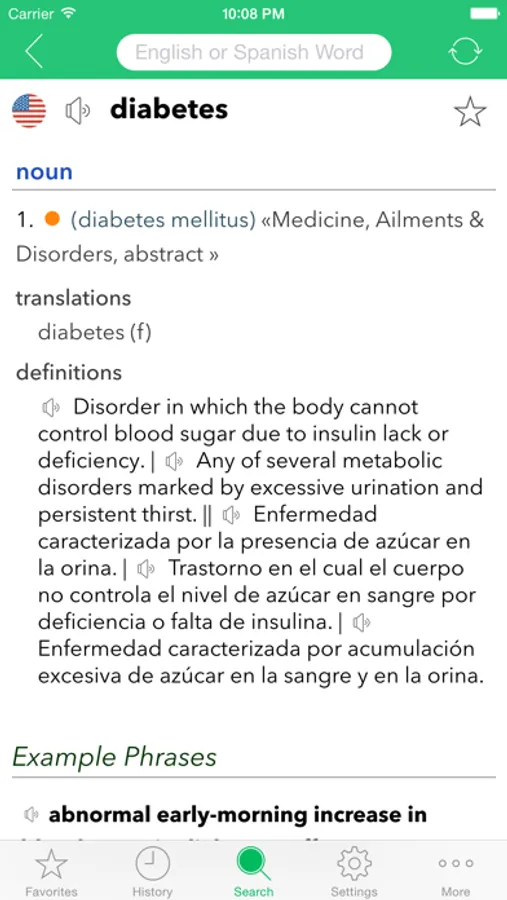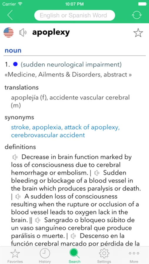• Natural-sounding voices for entries, definitions and examples in both languages (British and American English, European and American Spanish)