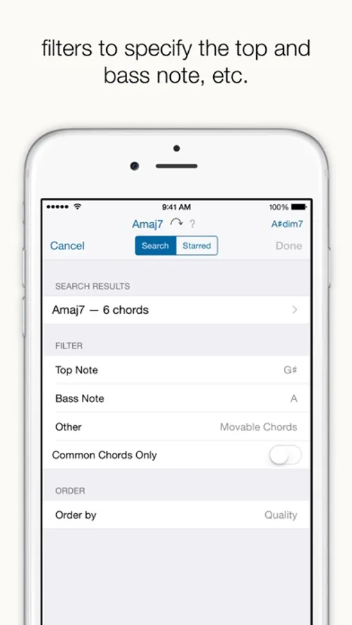 - find the perfect chord voicing with filters to specify the top and bass note, location on the fretboard, etc.