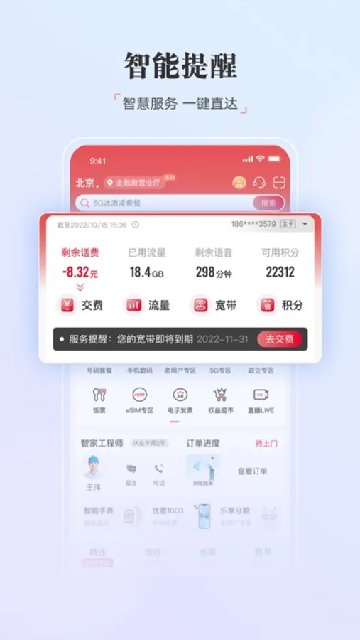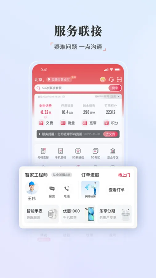 智家工程师、VIP客户经理竭诚服务,让您足不出户,即可快速办理业务。附近营业厅一键查询,线上取号,线下办理,无需等待,省时更省力。一站式全程贯通,真人服务更有温度。