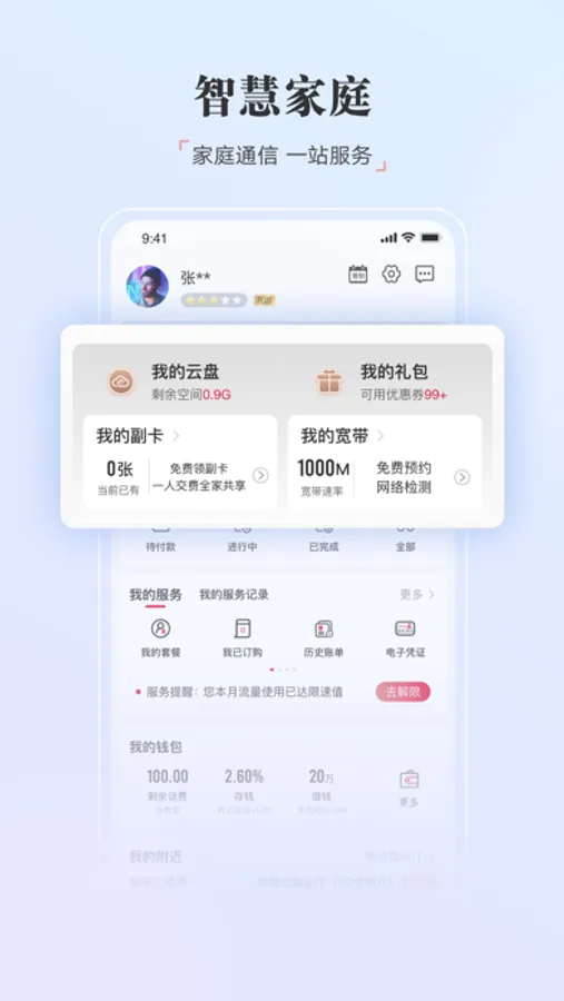 首页布局升级优化,查余额、交话费、办宽带……您需要的常用服务,首页一目了然,轻松一键直达。