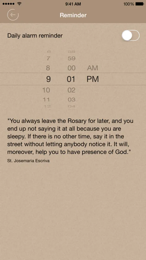 To encourage yourself to pray the rosary more often, there is a daily reminder feature.